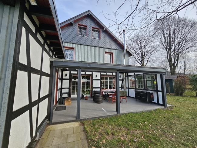 Das für diese Region typische Fachwerkhaus - ursprünglich aus ca. 1900 - wurde in den 1960er Jahre erweitert und als Hotel/Restaurant genutzt.