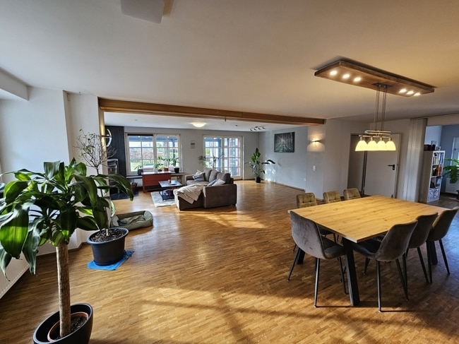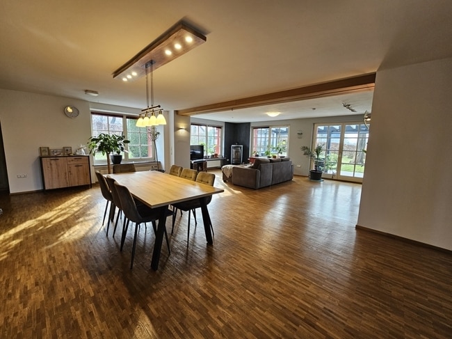 Wohn-, Ess- und Kaminzimmer mit Zugang zur überdachten Terrasse (ca. 28 m²)