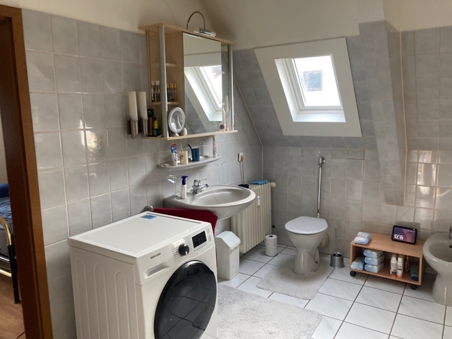 Die Wohnungen besitzen jeweils einen kleinen Eingangsflur mit eigenem Gäste-WC (Toilette, Waschbecken) und direktem Zugang zur Küche und dem Wohnzimmer. Beide Küchen sind sehr hell und geräumig und haben einen kleinen Einbauschrank zur Lagerung von Lebensmitteln. Über die offene Holztreppe im Wohnzimmer ist das 1. Obergeschoss erreichbar. Von einen kleinen Flur aus gelangt man in ein Gästzimmer, dass ebenfalls als Büro oder Kinderzimmer genutzt werden kann oder das große Bad (mit Badewanne, Dusche, WC, BD, Waschbecken) mit direkt angrenzendem Schlafzimmer. Das Dachgeschoss ist über eine (Boden-)Treppe vom Flur aus erreichbar und ist komplett ausgebaut und beheizbar.
