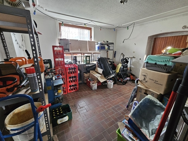Das Kellergeschoss ist über die Treppe im Erdgeschoss oder über separate Eingänge von außen zugänglich und bietet ausschließlich Lager- und Nutzfläche. Hier befinden sich der Heizungs- und Tankraum, sowie verschiedene Abstell-, Vorrats- und Lagerräume mit ausreichend Platz. Da der Keller eine eigene Zufahrt besitzt, kann er praktisch zum Be- und Entladen genutzt werden oder eignet sich ideal zum Unterstellen von Maschinen, Geräten oder Fahrzeugen. Ebenfalls wäre ein Umbau des Kellers als zusätzliche Wohnung denkbar. Über die Zufahrt ist ebenfalls eine separat stehende Garage mit Rolltor und zusätzlicher Lagerfläche erreichbar. Die Garage ist ausreichend groß dimensioniert, um Lieferwagen oder Wohnwagen/ Wohnmobile trocken und geschützt unterstellen zu können. Ebenfalls befindet sich am Eingangsbereich des Gebäudes ein kleiner Lagerschuppen.