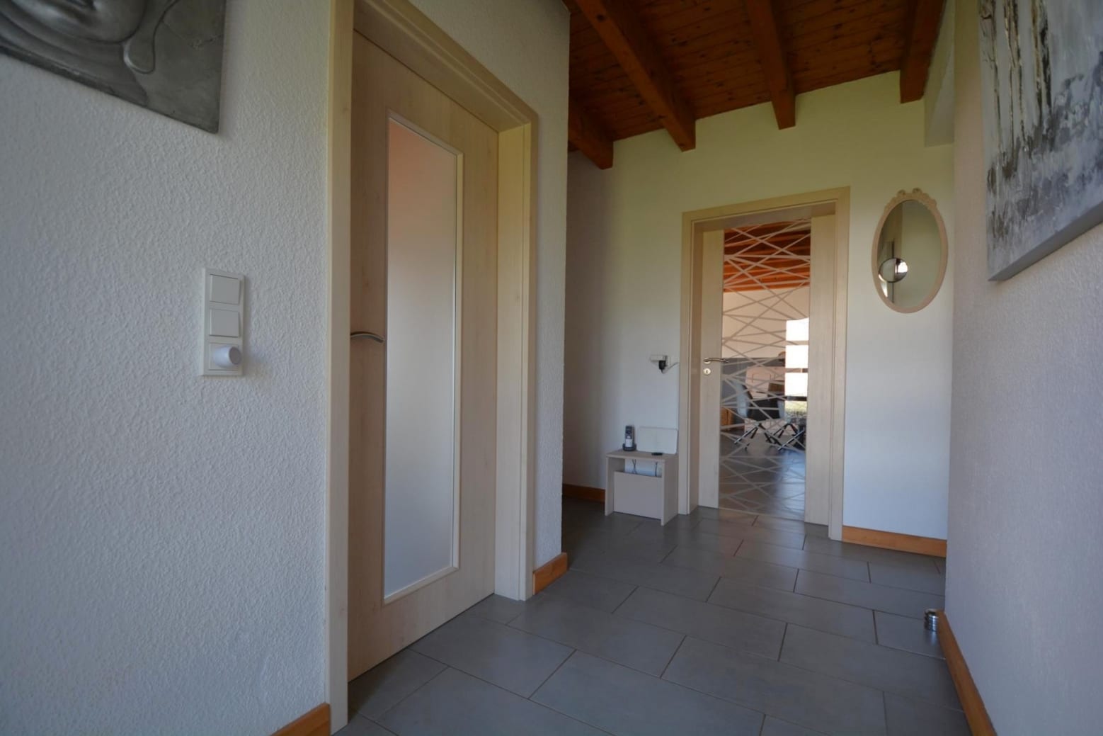 Flur, geräumiges Zimmer mit Waschmaschinenanschluss und Tür nach draußen, Badezimmer mit Dusche und WC.