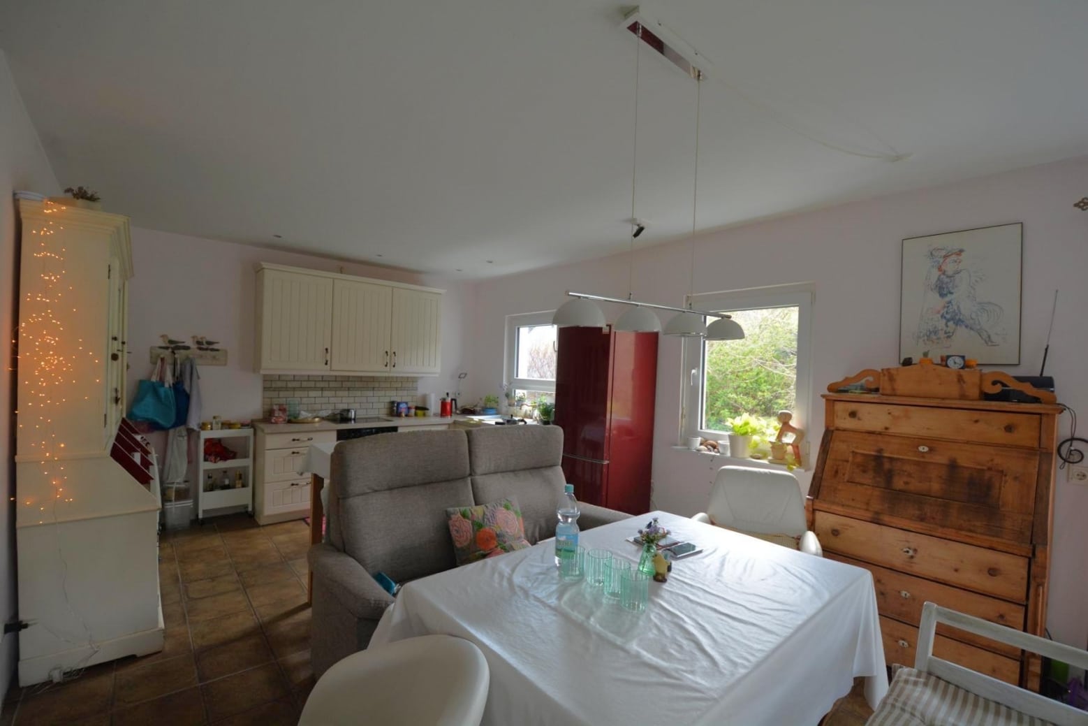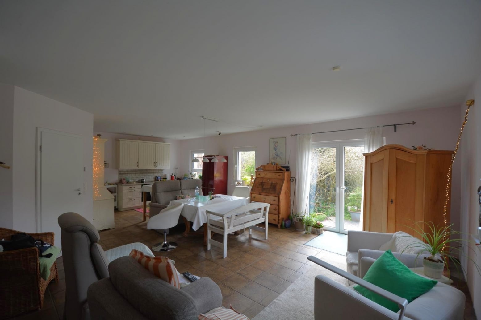 - Einen modernen Holzofen im geräumigen Wohnzimmer mit offener Küche.